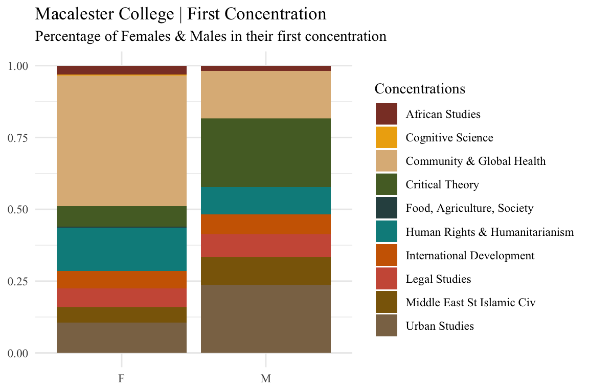 labs(x=NULL, y= NULL , fill= "Concentrations", title ="Macalester College | First Concentration", subtitle = "Percentage of Females & Males in their first concentration" ) +