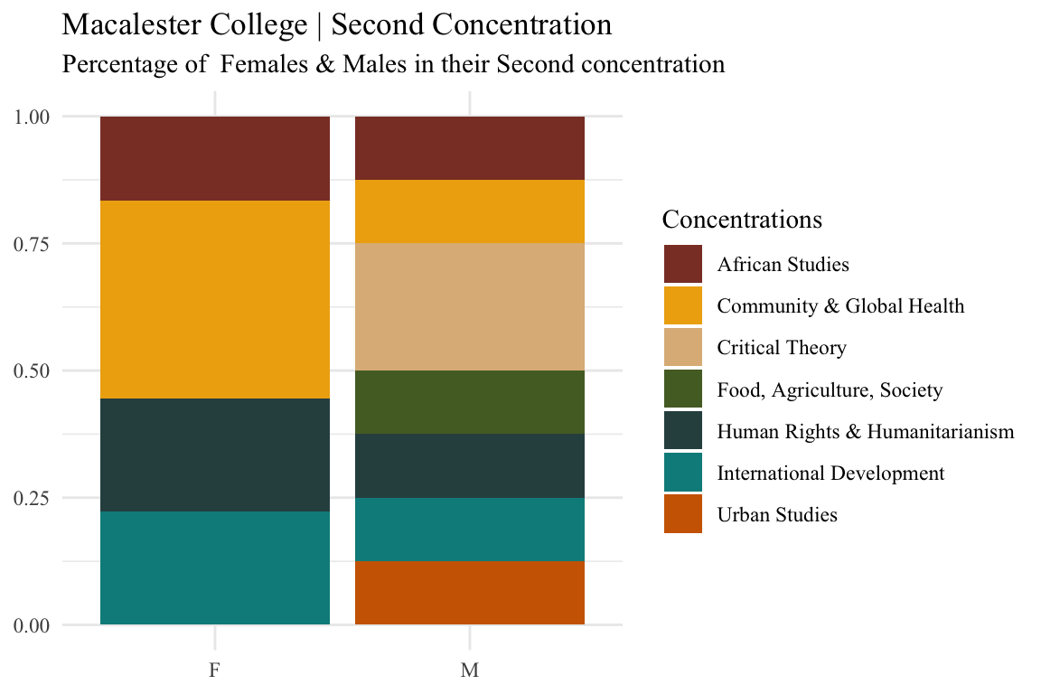 labs(x=NULL, y= NULL , fill= "Concentrations", title ="Macalester College | Second Concentration", subtitle = "Percentage of Females & Males in their Second concentration" ) +