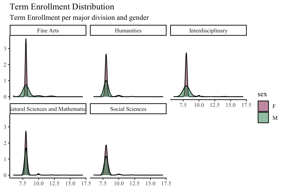labs(x=NULL, y= NULL, title = "Term Enrollment Distribution", subtitle = "Term Enrollment per major division and gender") +